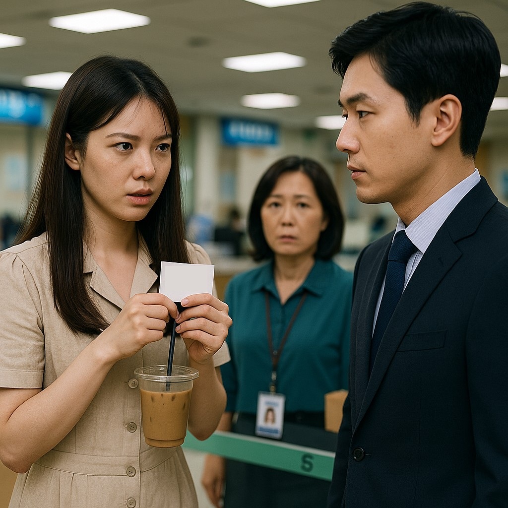 그 순간, 민원실 창구 너머에서 한 여성이 얼굴을 붉히며 고개를 들었다.